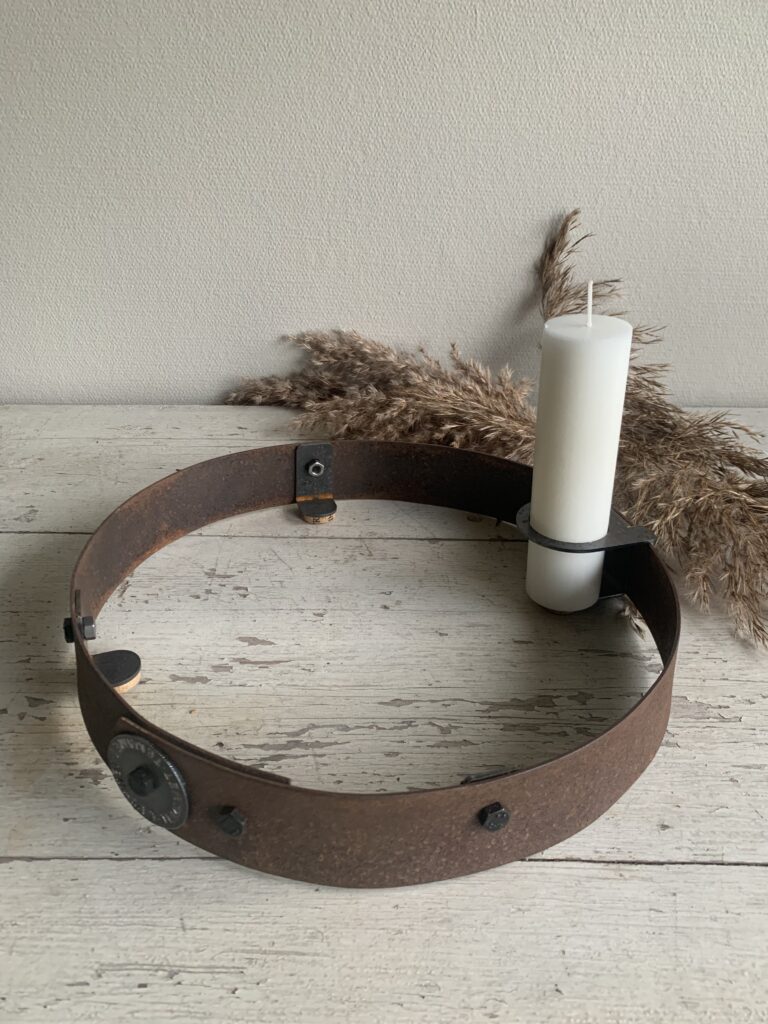 Ringen, av återbrukat tunnband, har diameter 285 mm och skyddar underlaget med fyra tassar av gamla återanvända vinkorkar. Om du själv vill pynta ringen med t ex murgröna går det också utmärkt eftersom ringen har ett mellanrum på 2-3 mm mellan underkant ring och underlag.